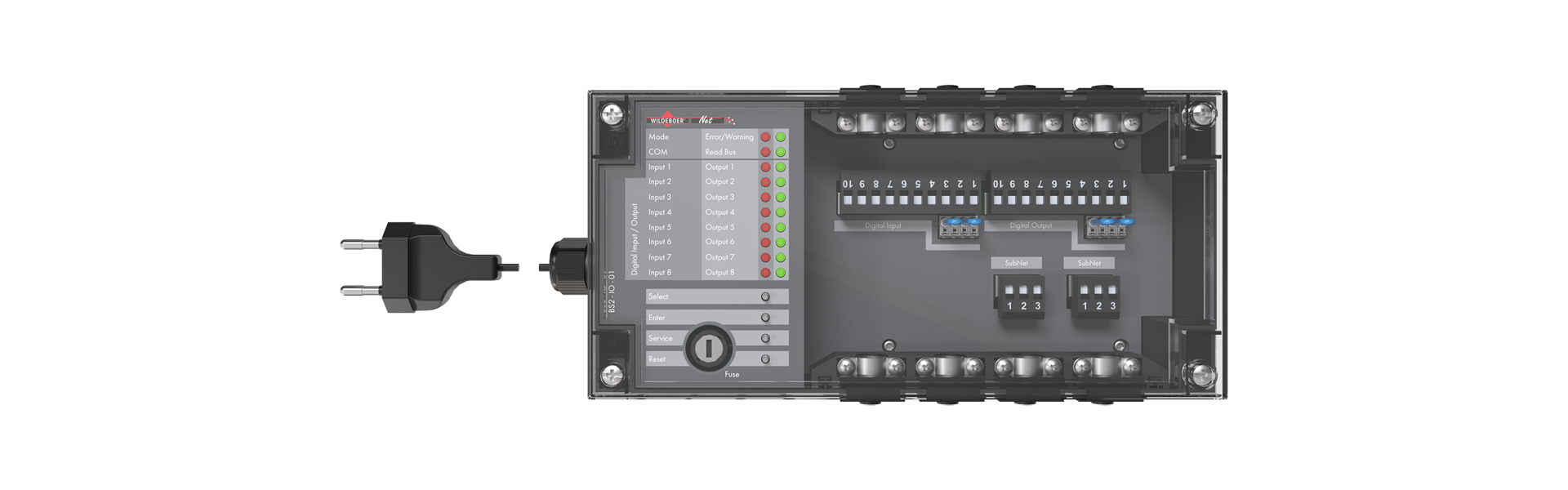 De BS2-IO-01 in-/uitgangsmodule maakt het mogelijk maximaal 8 externe sensoren en 8 externe aandrijftechnische componenten aan te sluiten in Wildeboer-Net. De module kan worden gebruikt voor master-slaveschakelingen als onderdeel van gebouwbeheersystemen en kan bijvoorbeeld ventilatoren uitschakelen. Alle activeringen en functies kunnen op afstand worden bediend en ook handmatig via de drukknoppen in de IO-module.